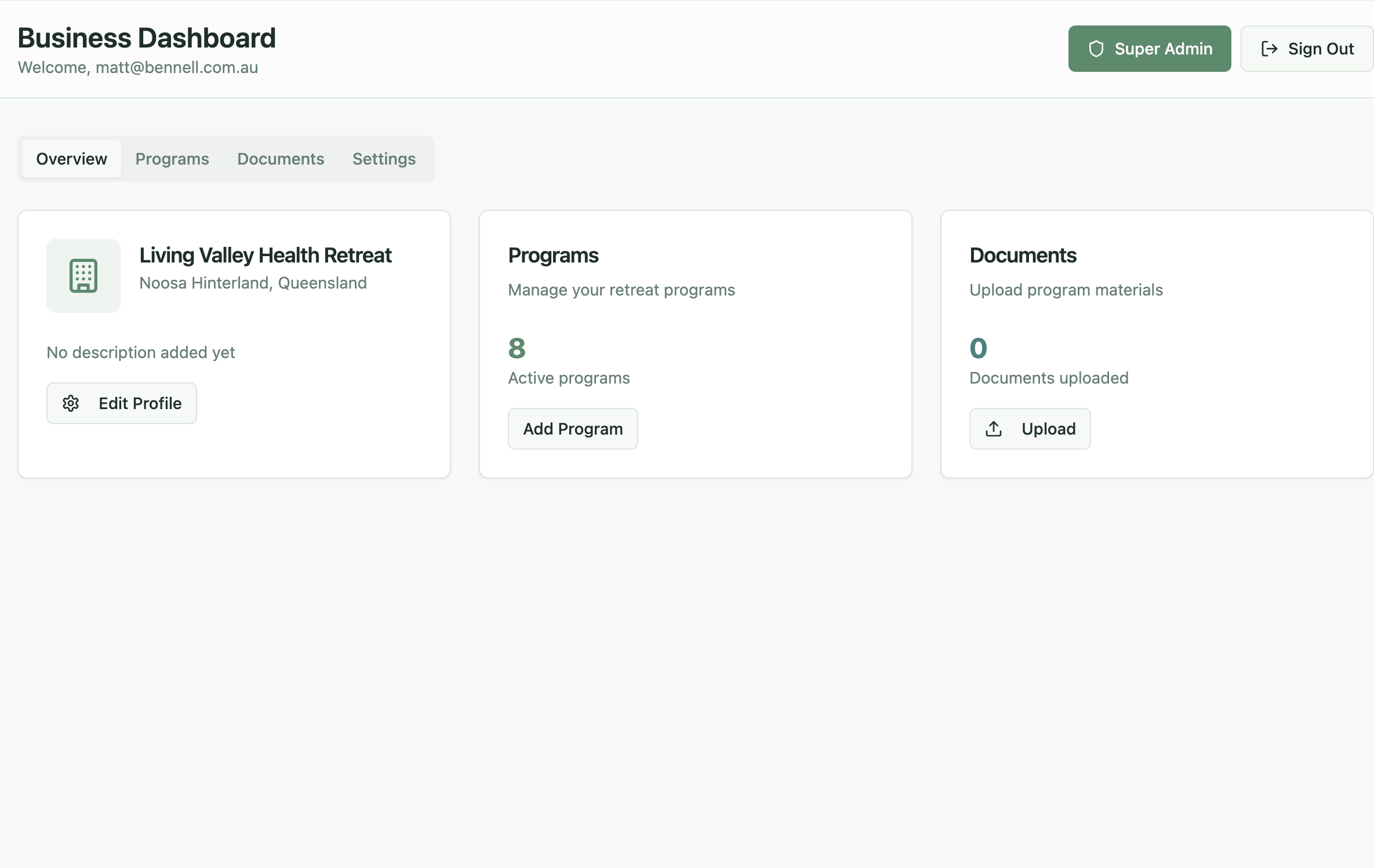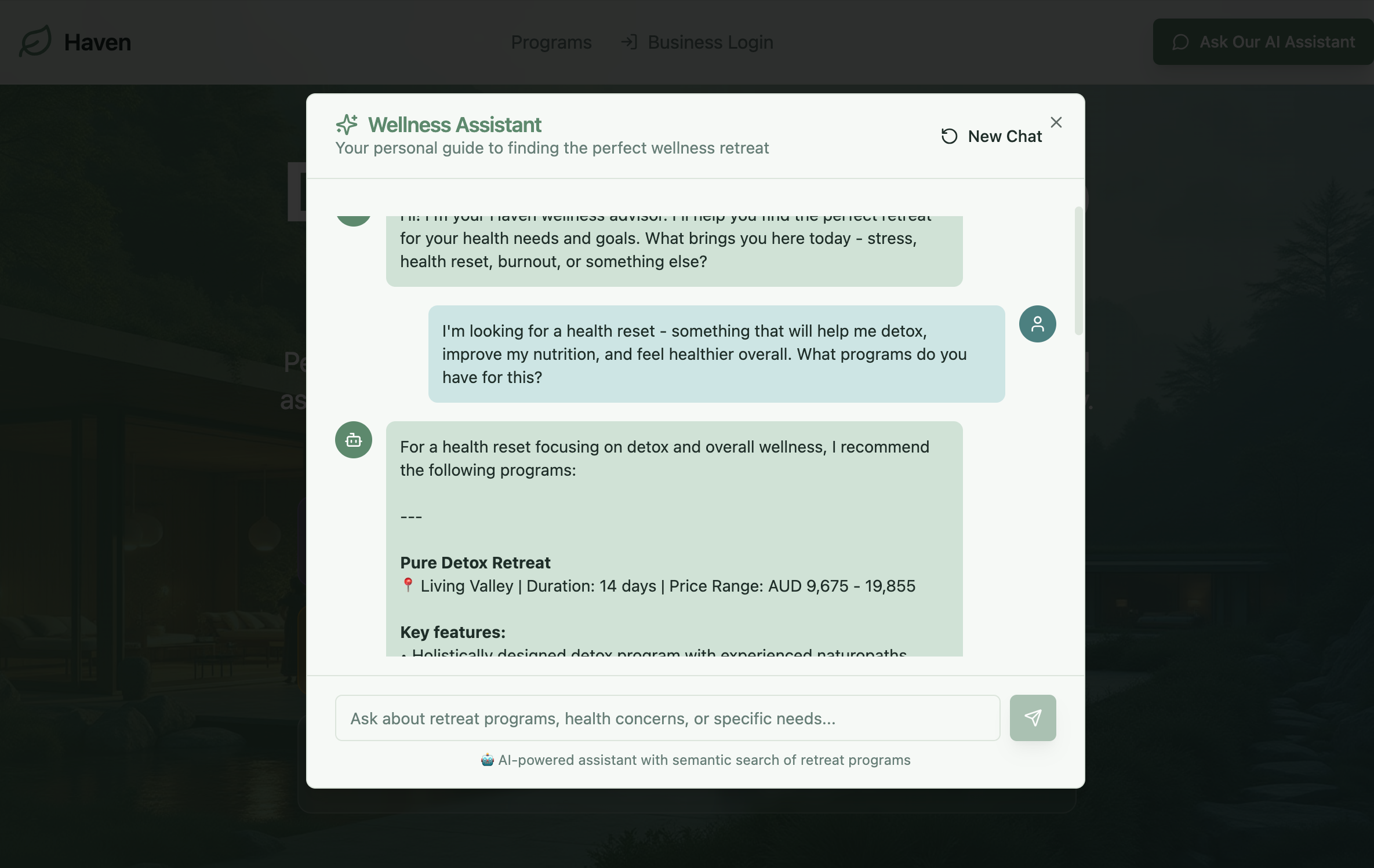 Built an intelligent matching system using OpenAI embeddings and pgvector. Every retreat program is converted into a 1536-dimensional vector, allowing for natural language understanding beyond keyword matching.
